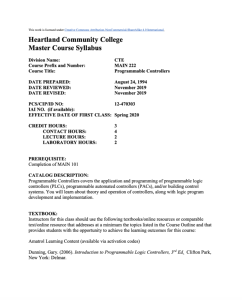 This 4-page syllabus provides an overview of the Programmable Controllers course taught at Heartland Community College. This course covers "the application and programming of programmable logic controllers (PLCs), programmable automated controllers (PACs), and/or building control systems." During the course, students "learn about theory and operation of controllers, along with logic program development and implementation." The syllabus includes a course description, learning outcomes, program outcomes, a sample course calendar, and more.
