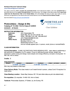 This 14-page syllabus, published by Northeast Wisconsin Technical College (NWTC), provide information about the Photovoltaics – Design and Site course taught at NWTC. During this course, students will "learn steps to performing a site audit prior to installation of a PV system." The course will also "focus on defining the solar window, system site placement, system sizing and design, load analysis and energy efficiency concepts."