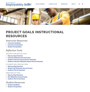 This curriculum page, from the Promoting Employability Skills website and published by SRI International, provides links to a number of resources on teaching and learning professional skills. Instructor resources, reflection tools, and student resources are included. Instructor resources include a handbook, instructor facing rubric, and a student facing rubric. Reflection tools include step-by-step directions, survey previews, Quatrics files for download, and more for instructors, students, and peers.