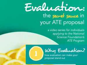This video runs 00:03:22 minutes in length. Other videos in this series, as well as the evaluation plan checklist resource highlighted in the video, are available to view separately. The next video in the series covers the "essential elements of an ATE proposal plan" and factors to consider when identifying an evaluator.