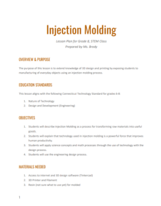 This 2-page lesson plan, provided by Northwestern Connecticut Community College, features an activity that expands students' "knowledge of 3D design and printing by exposing students to manufacturing of everyday objects using an injection molding process." In the activity, students examine everyday objects that were created through a molding process to eventually to create their own mold. Included in the lesson plan are education standards, objectives, materials and technology needed, and a description of the activity. Upon completing the lesson, students will be able to: