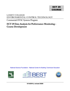 ECT 29: Data Analysis for Performance Monitoring is one of ten courses in the Environmental Control Technology Commercial HVAC Systems program. This 19-page instructor guide outlines the course, which introduces "... methods of acquiring HVAC equipment performance data to improve operations and reduce energy consumption." Emphasis is placed on data acquisition through using portable data loggers and DDC control systems, as well as on trending and visualizing data through tool like electronic databases and Microsoft Excel spreadsheets.
