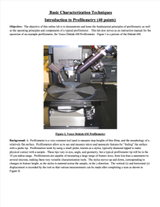 This 8-page lab guide, created by the Nanotechnology Applications and Career Knowledge Support (NACK) Center at Pennsylvania State University, is for an online laboratory activity on profilometry. During the lab, students will read and watch videos to learn about "the fundamental principles of profilometry as well as the operating principles and components of a typical profilometer." Included in the lab guide is textural information on profilometers, links to visual materials, instructional information on the components and operation of the Veeco Dektak 6M Profilometer, and post-lab student questions.