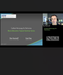 This webinar, published by the Nanotechnology Applications and Career Knowledge Support (NACK) Center at Pennsylvania State University, covers confocal microscopy education for technicians. During the Presentation, Peter Kazarinoff from Portland Community College provides a brief introduction to confocal microscopy, discusses the importance of learning confocal microscopy, and offers examples of confocal microscopy education. Additionally, Grant Shao, lab operator at Standford University, gives a demo of Stanford's confocal microscope.