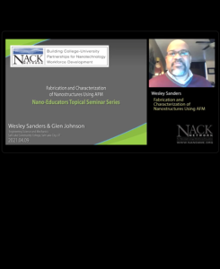 This webinar, published by the Nanotechnology Applications and Career Knowledge Support (NACK) Center at Pennsylvania State University, covers the fabrication and characterization of nanostructures using atomic force microscopy (AFM). During the Webinar, Dr. Wesley Sanders from Salt Lake Community College discusses the operation of an atomic force microscope along with a variety of other factors related to AFM. Discussed are topics such as different AFM operation modes, dip-pen nanolithography, and lateral force microscopy. Additionally, Johnson Glen, microscopy lab coordinator at Salt Lake Community College, demonstrates the use of an atomic force microscope.