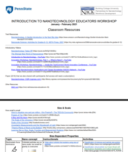 This 6-page resource, published by the Nanotechnology Applications and Career Knowledge Support (NACK) Center at Pennsylvania State University, features links to in-class nanotechnology teaching resources. Included are general nanotechnology education resources and resources related to specific concepts, including size and scale, fabrication, characterization, and size-dependent properties (electrostatic force dominance, light matter interactions, etc.). Also included are links to news outlets for nanoscience and nanotechnology research.