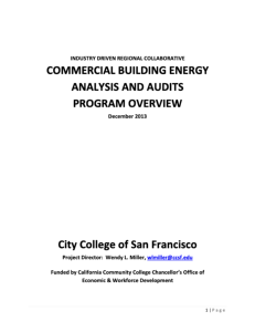 The Commercial Building Energy Analysis and Audits program at City College of San Francisco prepares students to conduct energy audits, evaluate building systems for efficiency, analyze energy data, and apply financial and business strategies in audit reporting. The program is divided into 15 modular courses designed for a community college level student. These courses are adaptable and can be selected, reorganized, or offered in a shorter format to suit individuals with experience in construction, architecture, HVAC, building operations, or mechanical engineering.