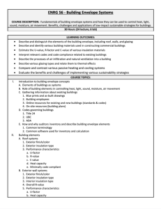 This course covers the "fundamentals of building envelope systems and how they can be used to control heat, light, sound, moisture, air movement." The "benefits, challenges and applications of low-impact sustainable strategies for buildings" is also covered. This outline includes a course description, learning outcomes, course topics, types of assignments, and textbooks and resources needed. Course topics include an introduction to building envelope concepts, codes governing buildings, building elements, exterior wall systems, ground floor systems, fenestration, interior construction, skylights, natural ventilation and more.