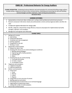 This course covers "professional business behavior and communications for commercial building energy auditors." This outline includes a course description, learning outcomes, course topics, types of assignments, and textbooks and resources needed. Course topics include: setting up for success, appropriate communications, telephone communications, written communications, and face to face communications.