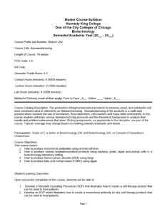This 5-page syllabus provides an overview of the Biotech 262: Biomanufacturing course taught at Kennedy King College. This course introduces students to concepts of the production of biopharmaceutical products using bacteria, yeast, and eukaryotic cell lines. Students will learn about bioreactors, flow cytometers, cell counters, and other instruments. Biomanufacturing protocols will also be studied so that students can analyze lab results and problem solve any errors that arise.