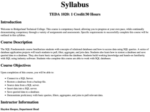 This SQL Fundamentals course, taught at Bridgerland Technical College, familiarizes students with concepts of relational databases and how to access data using SQL queries. During the course, a series of database application projects teach students to pull, filter, aggregate, and join data. Students will also learn how to restore a database, save queried data to a database, and learn basic navigation within the database. Students will build working knowledge and hands-on familiarity with SQL using industry software.