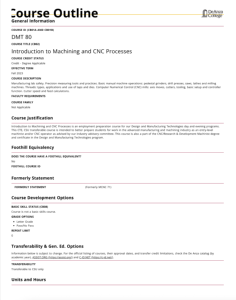 This 6-page course outline provides general information about the Introduction to Machining and CNC Processes course taught at De Anza College. During this course, students will learn about manufacturing lab safety, precision measuring tools and practices, basic manual operations, threads, computer numerical control (CNC) mills, and cutter speed and feed calculations.