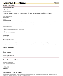 This 5-page course outline provides general information about the Applied Geometric Dimensioning and Tolerancing (GD&T) course taught at De Anza College. This course focuses on "the interpretation of specifications and inspection procedures related to current ASME Y14.5 [...] GD&T standards." During the course, students learn to apply these standards using precision measuring tools and computer-aided Coordinate Measuring Machines (CMM) in a manufacturing environment. Machine and part set-up for measuring form, orientation, and position call-outs are demonstrated.