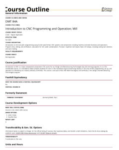 This 5-page course outline provides general information about the Introduction to CNC Programming and Operation) course taught at De Anza College. This course is an introduction to tool path programming using G and M codes, CNC systems and components, program entry, calculation for mill cutter compensation , basic mill setups, and more.