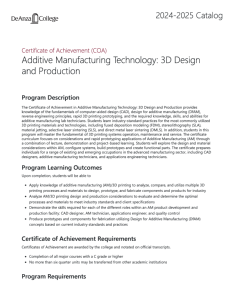 This 4-page course outline provides information about the Design for Additive Manufacturing course, which is taught at De Anza College and offers a comprehensive overview of industrial 3D printing and design for additive manufacturing (DfAM) principles. During the course, students will learn about "implementation and operation options in industry production and rapid prototyping."