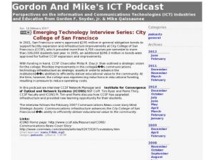 Gordon and Mike's ICT Podcast offers perspectives on the information and communication technologies (ICT) industries from Gordon Snyder and Mike Qaissaunee. In this podcast, Mike and Gordon interview Tim Ryan, City College of San Francisco (CCSF) Network Manager and Pierre Thirty, CCSF faculty member. Together, the talk about "how CCSF has upgraded infrastructure and provided new learning opportunity for their students." Running time for this show is 30:58.