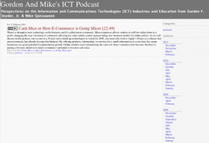 Gordon and Mike's ICT Podcast offers perspectives on the information and communication technologies (ICT) industries from Gordon Snyder and Mike Qaissaunee. In this podcast, the second in a ten-part series of technologies to watch in 2006, Mike and Gordon discuss microcommerce, which allows "vendors to sell low-ticket items at a profit, changing the way e-business is conducted, allowing for value-added content and providing new business models for online sellers." The running time for this show is 22:49.
