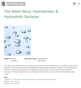Published by the National Nanotechnology Coordinated Infrastructure, and created by Alonda Droege and the University of Washington, this 50-minute activity "explores how nanotechnology can be used to change the properties of a surface so that it either attracts or repels water." The Teachers' Guide PDF details the necessary materials and advanced preparation for the activity, as well as background information, laboratory questions, and safety information. The Student Worksheet PDF gives background information needed to explore hydrophilic and hydrophobic surfaces, the materials for the laboratory activity, and step-by-step procedures with illustrations. There is also a place for students to record their observations and three summary questions following the activity. This is an excellent activity for students to learn about nanotechnology and hydrophobic / hydrophilic surfaces first hand.