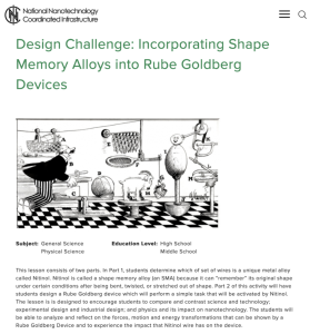 Published by the National Nanotechnology Coordinated Infrastructure, this activity allows students to design their own Rube Goldberg device which incorporates shape memory alloys. The goals of the lesson are to "encourage students to compare and contrast science and technology; experimental design and industrial design; and physics and its impact on nanotechnology." This module is designed to introduce and let student teams design their devices in class and create a commercial for their device. Background readings, worksheets, project directions and procedures, rubrics, and the needed materials are given on this site.
