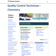 This page from Bio-Link's career website features information about the different jobs and opportunities in the chemistry quality control technician career area. This page includes a brief description of chemistry quality control techicians, who "test all raw materials, packing materials, and...