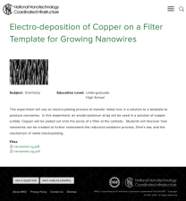 This lesson, presented by the National Nanotechnology Coordinated Infrastructure, allows students a chance to experiment using the electro-plating process to produce nanowires. In addition to learning about the production of these components, students will gain a greater understanding of "...