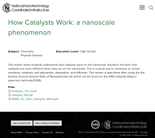 This demonstration, presented by the National Nanotechnology Coordinated Infrastructure, exposes students to the functionality of catalysts on a nanoscale. This lesson is "a great way to introduce or review reactants, catalysts, and adsorption, desorption, and diffusion. Use this demonstration after...