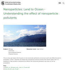 This lab, presented by the National Nanotechnology Coordinated Infrastructure, introduces students to the intersection between plastics, nanotechnology, and aquatic ecosystems. During the lab, students will "model how nanoparticle pollution travels from land to water. This lab is part 1 of a 2-part...