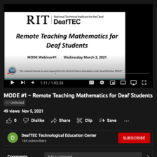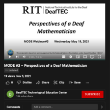This video, published by DeafTEC at the Rochester Institute of Technology, is the first in a series of Math Observation in Deaf Education (MODE) webinars. In the video, Dawn Kidd, Nancy McCanless, and Laura Metcalfe discuss the remote teaching of mathematics for deaf students. Remote education...