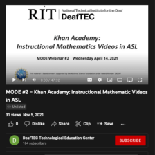 This video, published by DeafTEC at the Rochester Institute of Technology, is the second in a series of Math Observation in Deaf Education (MODE) webinars. In the video, Keith Mousley and Nick Catalano talk about their work with Khan Academy in providing instructional mathematics videos in American...