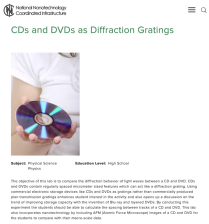 This lesson, presented by the National Nanotechnology Coordinated Infrastructure, covers the diffraction behavior of light waves. Students will discover how CDs and DVDs contain regularly spaced micrometer sized features that act like diffraction grating. Using these items rather than commercially...