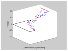 This is an animation of a Schmitt trigger circuit with clean input voltage. Voltages and parts of the circuit of this 3-D animated .gif are highlighted with different colors. Current is displayed by green arrows indicating directional flow.