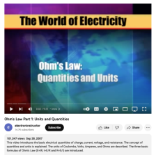This video provides an overview of Ohm's Law and "introduces the basic electrical qualities of charge, current, voltage, and resistance. The concept of quantities and units is explained. The units Coulombs, Volts, and Ohms are described. The three basic formulas of Ohm's Law (E=IR, I=E/R and R=E/I)...
