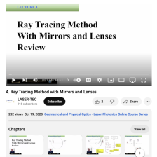 This video is part of a series from Laser-Tec that introduces learners to geometrical optics. The video provides a review of the ray tracing method for mirrors and lenses. Case studies for concave mirrors, convex mirrors, converging lenses, and diverging lenses are highlighted. The video recording...