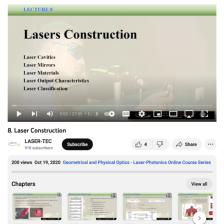 This video is part of a series from Laser-Tec that introduces learners to geometrical optics. This video explores the construction of lasers. Laser cavities, mirrors, materials, output characteristics, and classification are highlighted. The gain of a laser's medium, traverse modes, laser line...