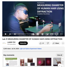 This video from Laser-Tec is part of a series of light and optics experiments. In this lab, participants measure the diameter of human hair using diffraction. Participants learn about the diffraction of light on human hair and a thin metal wire, and then calculate the thickness of the hair and wire....