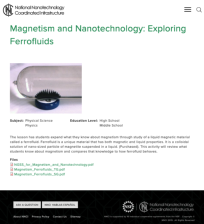 This lesson, presented by the National Nanotechnology Coordinated Infrastructure, covers magnetism. Students will experiment with ferrofluid which is "a unique material that has both magnetic and liquid properties. Ferrofluid is a colloidal solution of nano-sized particle of magnetite suspended in a...