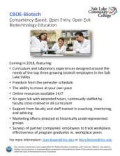 This collection includes outreach materials for the competency-based Biotechnology program at Salt Lake Community College. Materials include two flyers, an article, and a PowerPoint presentation. These resources include information about the development of the program, the importance of...