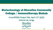 This PowerPoint presentation from Shoreline Community College and Dr. Orlando de Lange was given to the InnovATEBIO community in April 2025. The presentation provides information about Dr. de Lange, Biotechnology programs at Shoreline Community College (SCC), and the Immunotherapy BioHub Advanced...