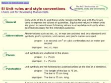 This page from the National Institute of Standards and Technology provides an SI Unit rules and style conventions checklist for reviewing manuscripts. There are 22 aspects of the checklist including General, Abbreviations, Plurals, Punctuation, Multiplication and division, typeface, and more.