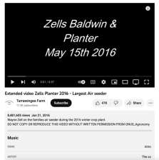 This video, Published by ONUS Agronomy, shows a Zells air seeder navigating around trees while planting crops in an agricultural field. The recording runs 6:57 minutes in length.