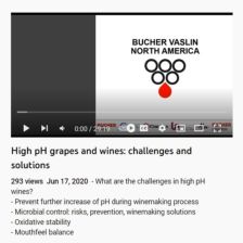 This webinar from Bucher Vaslin North America explores high pH in grapes and wines. In the video, the challenges associated with high pH wines are highlighted, tips for preventing the increase of pH during winemaking are provided, microbial control is explored, oxidative stability is explained, and...