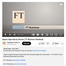This video, made available by the Financial Times, provides information on the use of agricultural drones to assist elderly rice farmers in Japan. The video shows Yamaha drones spraying pesticides on rice fields and paddies. A brief interview with a Japanese rice farmer who uses Yamaha drones is...