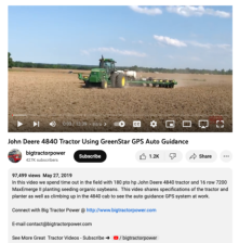 This video, from Big Tractor Power, features a John Deere 4840 tractor using GreenStar GPS auto guidance. This video shows "... time [spent] out in the field with 180 pto hp John Deere 4840 tractor and 16 row 7200 MaxEmerge II planting seeding organic soybeans. This video shares specifications of...