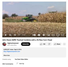 This video, published by Big Tractor Power, shows a "class nine John Deere S690 Tracked Combine with a 16 row corn head" harvesting corn in western Kentucky. The machine is shown in action from various angles while a narrator describes the harvesting process and the combine in detail. The corn head...