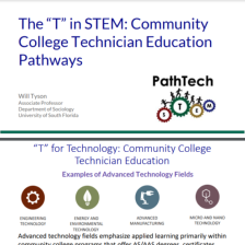 These presentation slides, published by the University of South Florida, highlight technician education pathways in community college for advanced technology fields, such as engineering technologies, energy and environmental technologies, advanced manufacturing, and micro and nano technologies. In...