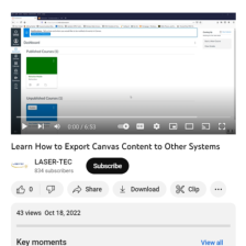 This video from LASER-TEC provides steps on exporting Canvas content to other learning management systems. Steps on exporting courses, importing them into other learning management systems, uploading files, and importing parts of courses are highlighted. The video recording runs 6:53 minutes in...