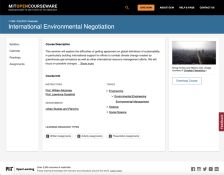 This page is a course overview for Massachusetts Institute of Technology’s (MIT) course 11.364, International Environmental Negotiation. The site contains materials from a graduate research seminar on complex negotiations of international environmental issues. The class explores the challenges of...