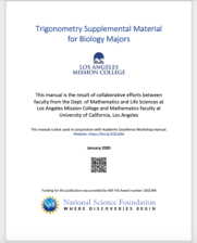 This manual, created by Los Angeles Mission College, supports the study of trigonometry for biology majors. Included are worksheets, test review questions, and answer keys pertaining to topics like trigonometric and inverse trigonometric functions, graphing, and vectors and polar coordinates. The...