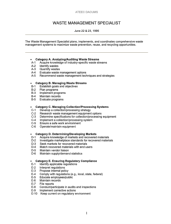 The Advanced Technology Environmental and Energy Center (ATEEC) provides this DACUM, or curriculum development tool, for waste management specialists. This 3-page document includes a general occupation description and job tasks in categories such as analyzing/auditing waste streams, managing waste...