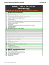 This two page PDF, created by Northeast Biomanufacturing Center and Collaborative, discusses the key functions and tasks of a quality control technician (microbiology). The document focuses mostly on: the work compliance with both EH&S and cGMPS, the cleanliness and maintenance of production areas,...